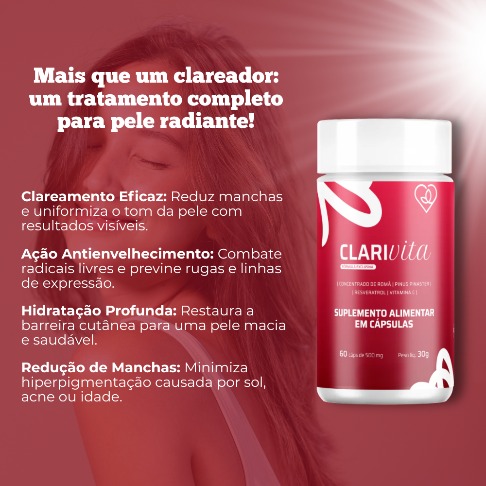 O Clarivita é um suplemento alimentar desenvolvido com ingredientes naturais e ativos dermatologicamente comprovados, ideal para quem busca uma pele mais saudável, hidratada e jovem. Sua fórmula exclusiva combina colágeno tipo II, ácido hialurônico, vitaminas e antioxidantes que atuam nas camadas mais profundas da pele.